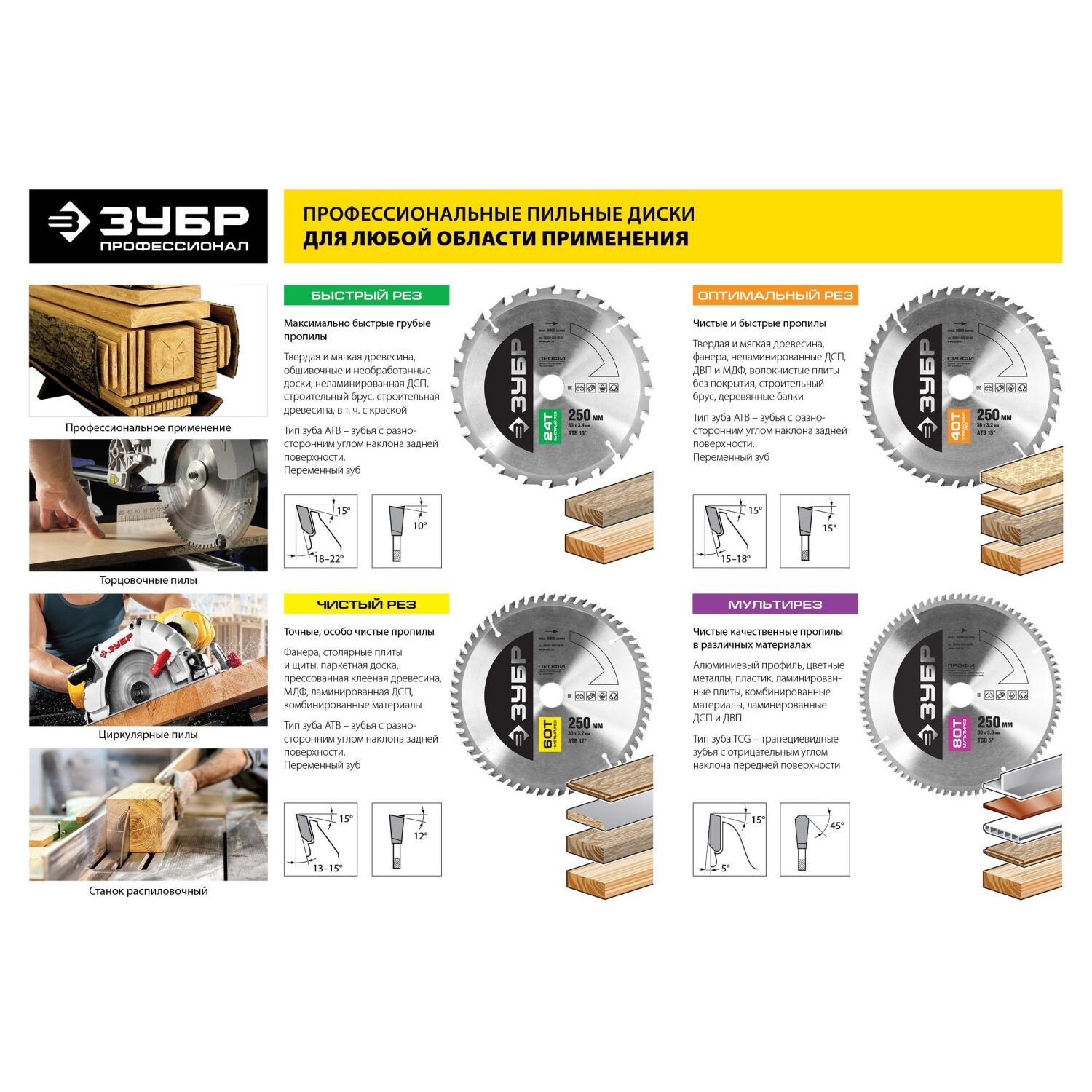 Пильные диски ″Зубр Профи″ специально разработаны для долгосрочного и эффективного пиления.