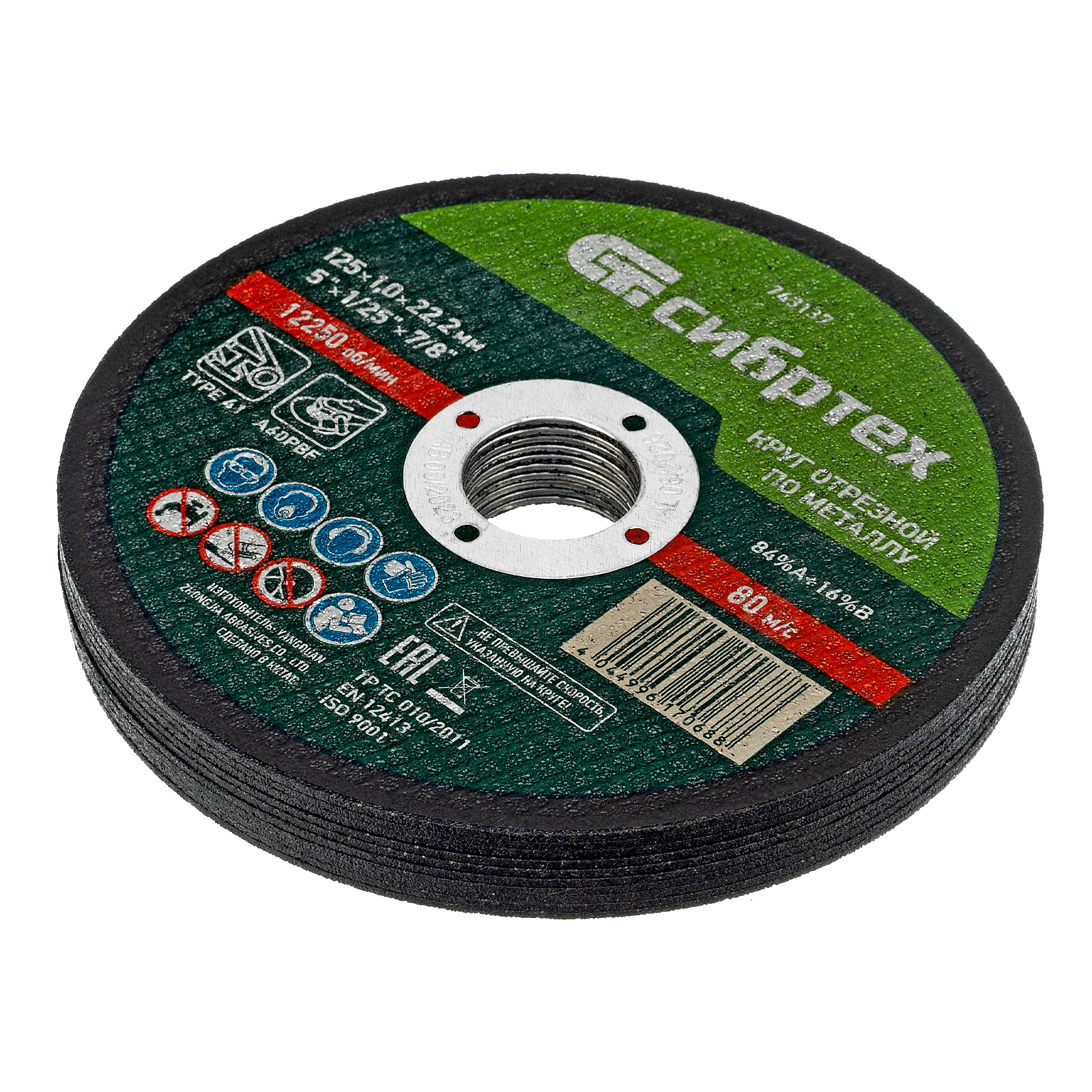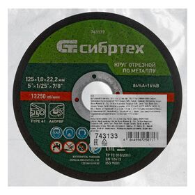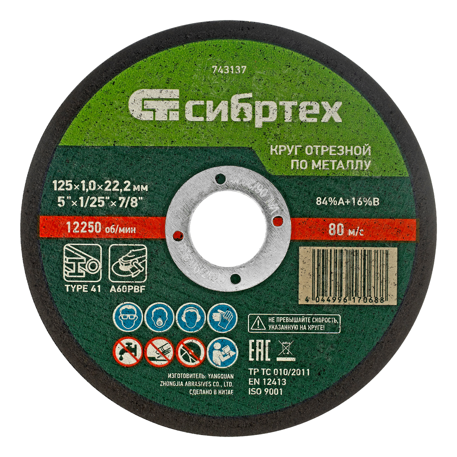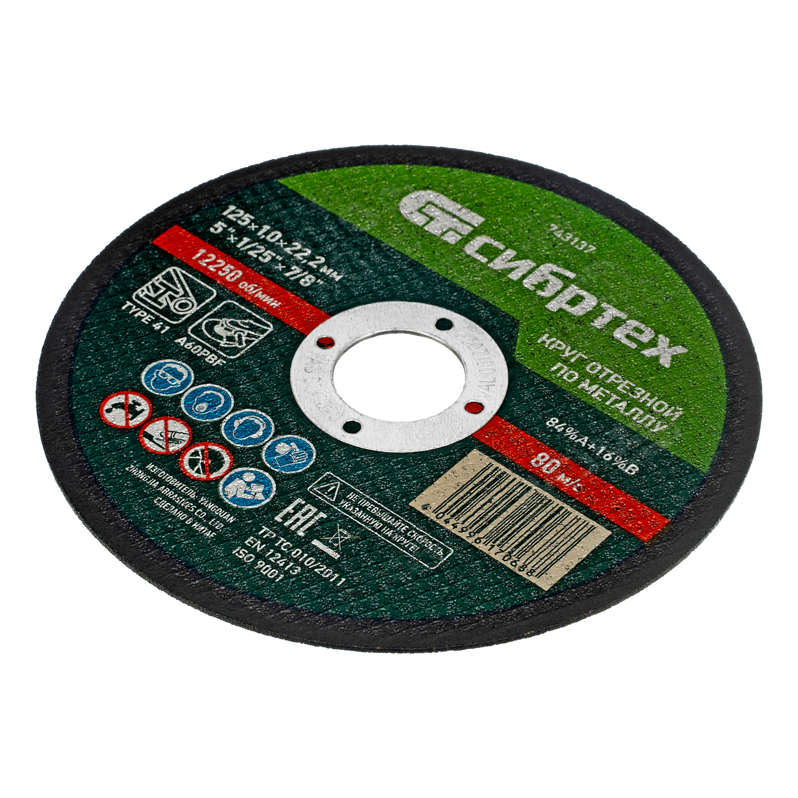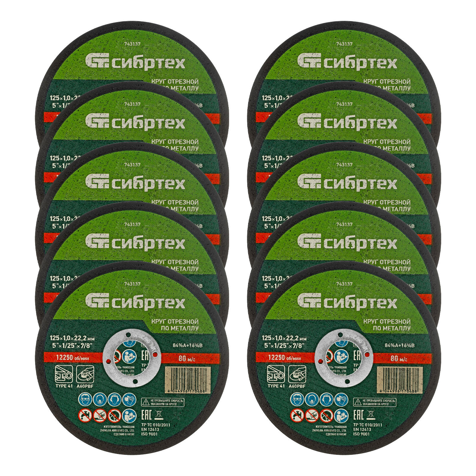 Круг отрезной по металлу, 125 х 1,0 х 22,2 мм, 84%A+16%B, в пленке, 10 шт Сибртех СИБРТЕХ