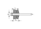- Корпус заклепки изготовлен из алюминиевого сплава AlMg1.5 c улучшенными механическими свойствами: высокая пластичность, повышенная коррозионная стойкость. Стержень заклепки изготовлен из оцинкованной стали.
