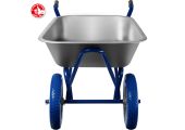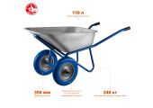 - -Cтальной кузов толщиной 0,9мм и объемом 130л для сыпучих грузов имеет цинковое покрытие, обеспечивающее защиту тачки от внешних воздействий.,