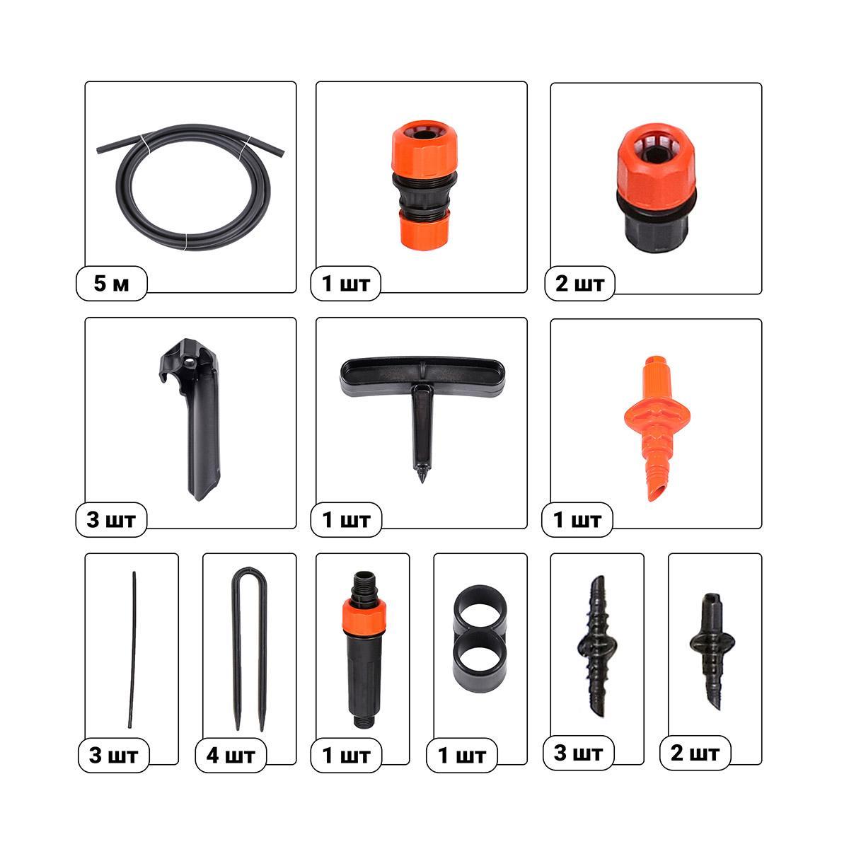 - Комплект на 1 грядку рассчитан для организации полива на площади 4 м2 или на грядку размером 4 x 1 м при посадке растений в 2 ряда.