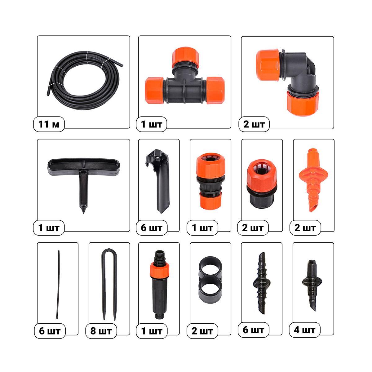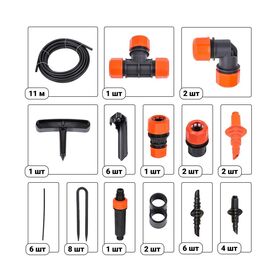 - Комплект на 2 грядки рассчитан для организации полива на площади 8 м2 или на две грядки размером 4 x 1 м при посадке растений в 2 ряда.