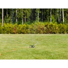 Круговой дождеватель подходит для полива маленьких участков диаметром до 13 метров. Благодаря круговому движению наконечников осуществляется равномерный полив сада.