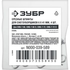 ЗУБР 6х41 мм, 4шт., срезные штифты для снегоуборщиков (N000-039-589)