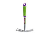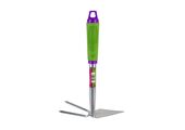 Инструмент имеет стальное сердцевидное лезвие на одной стороне и три зубца для рыхления почвы на другой.