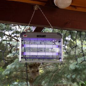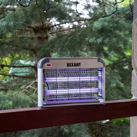 Антимоскитная лампа Rexant - современное экологически безопасное средство по борьбе с комарами, москитами, мошкой, мотыльками и другими летающими видами насекомых внутри помещения. Устройство излучает ультрафиолет и нагревается, тем самым имитирует млекопитающих животных и манит насекомых. Насекомые, подлетая, получают смертельный удар током от металлической сетки под напряжением.