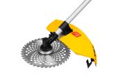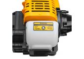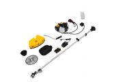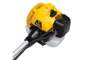 Бензиновый триммер Denzel DT-52E 962025 с двигателем объемом 52 куб. см, с неразъемной штангой и электростартером, поставляется комплектом из 2 частей и используется для ухода за дачным участком. С его помощью можно подравнять газон, скосить траву любого типа, в том числе с жесткими древовидными стеблями (полынь, крапива, лебеда, борщевик), а также срезать кустарник и молодые побеги деревьев с диаметром стволов до 10 мм. Триммер успешно справляется с этими задачами благодаря входящим в комплект катушке с леской и пильному диску с шириной скашивания 42 и 25,5 см соответственно. На штангу уже установлен редуктор и корпус сцепления, что упрощает подготовку инструмента к работе.