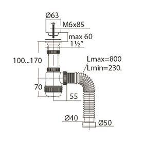 Сифон VIRPlast Элит Мини, с нержавеющей чашкой d 63 мм, гофротруба 800 мм, 40 x 40/50 мм