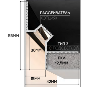 Алюминиевый теневой профиль потолочный с подсветкой. Анодированный черный. 1 слой по 12,5мм. L=2500 ТИП3АНОД-СВЕТ, 1 слой.