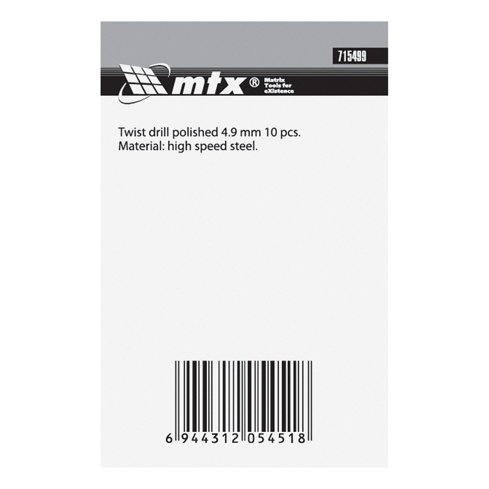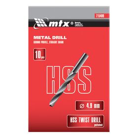 Полированное сверло по металлу MTX 715499 из стали HSS, с цилиндрическим хвостовиком, 10 шт. в упаковке, используется для получения отверстий диаметром 4,9 мм. Угол заточки составляет 118°, поэтому сверло оптимально для работы с черными металлами, сталью, чугуном и твердой бронзой. Расширенные канавки обеспечивают эффективное удаление стружки, что повышает скорость сверления.