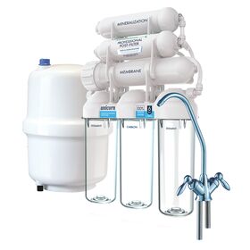 Система очистки для получения воды наивысшего качества. Несколько ступеней очистки, включая обратноосмотическую мембрану, позволяют удалить до 99% всех видов загрязнений, включая бактерии и вирусы. Очищенная вода накапливается в отдельном баке и подается через кран, отдельно устанавливаемый на кухонной мойке.
