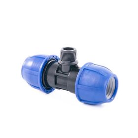 Тройник компрессионный с наружной резьбой предназначен для соединения между собой двух полиэтиленовых труб ПНД и выходом на наружное резьбовое соединение других элементов трубопровода.