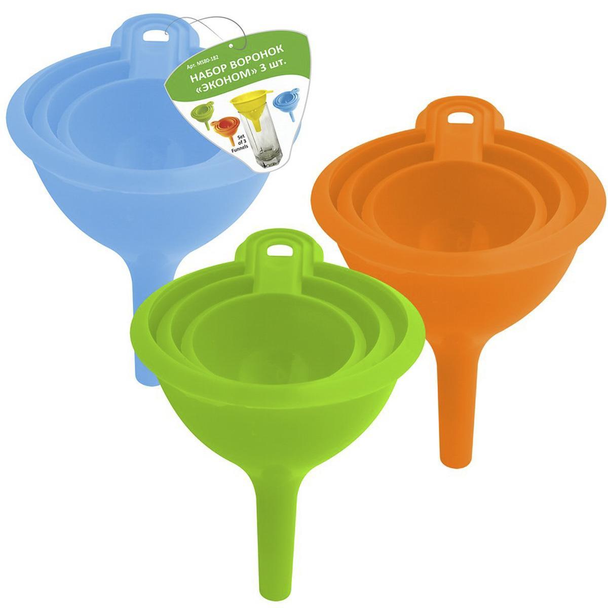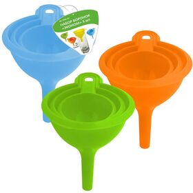Набор воронок позволяет подобрать нужный размер для конкретной посуды – для емкостей с узким или широким горлышком, для переливания больших и маленьких объемов жидкостей. Набор включает 3 воронки, которые вкладываются одна в другую, что очень удобно при хранении. Изделия изготовлены из полипропилена – прочного и гигиеничного материала.