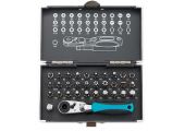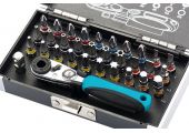 Набор бит торговой марки GROSS предназначен для монтажа/демонтажа резьбовых соединений при проведении слесарно-монтажных работ. В наборе 30 бит, изготовленных из высококачественной инструментальной стали S2, со шлицами PH1, PH2, PH3, PZ1, PZ2, PZ3, T10, T15, T20, T25, T27, T30, T40, H3, H4, H5, H6, SL3, SL4, SL5, SL6, ТН10, ТН15, ТН20, ТН25, ТН27, ТН30 и ТН40, которые являются наиболее востребованными при проведении различных работ. Для соединения разных типоразмеров в наборе предусмотрен переходник с шестигранника на квадрат длиной 25 мм. Со стороны квадрата в переходнике установлен металлический шарик-фиксатор. Битодержатель из хромированной стали снабжен магнитом, который предотвращает выпадение бит во время работы.