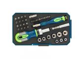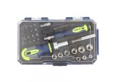 - В комплект входит реверсивная отвертка, биты, торцевые головки.