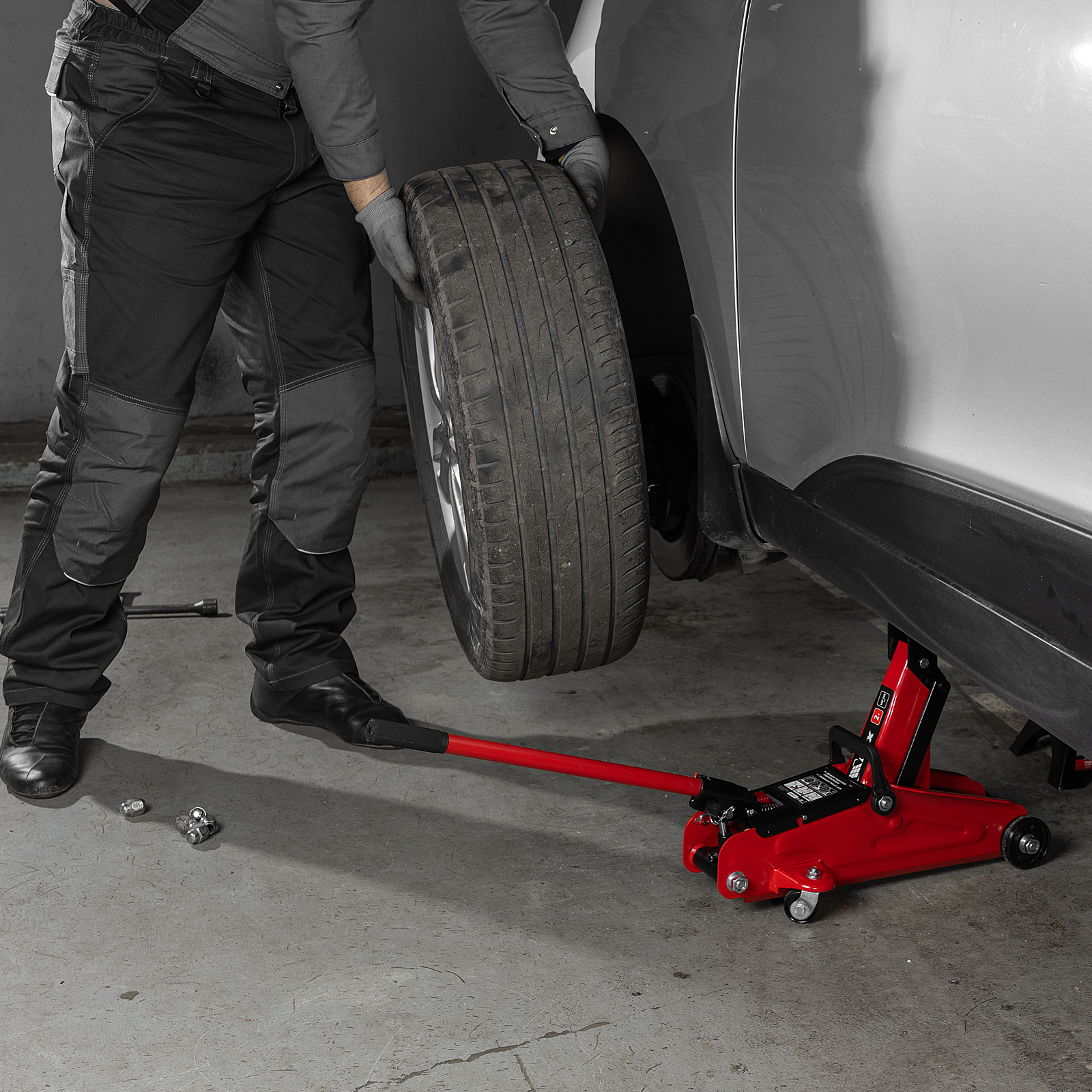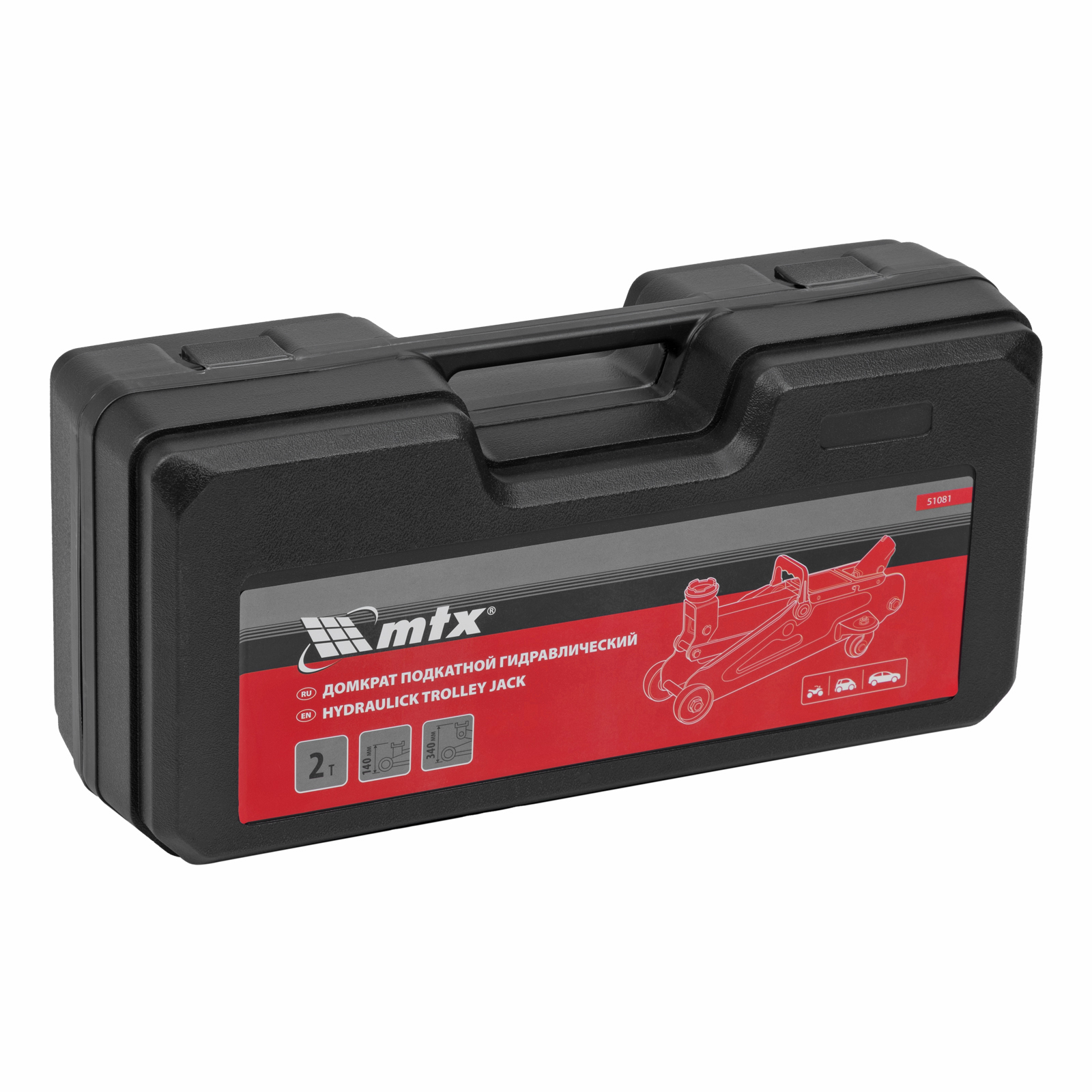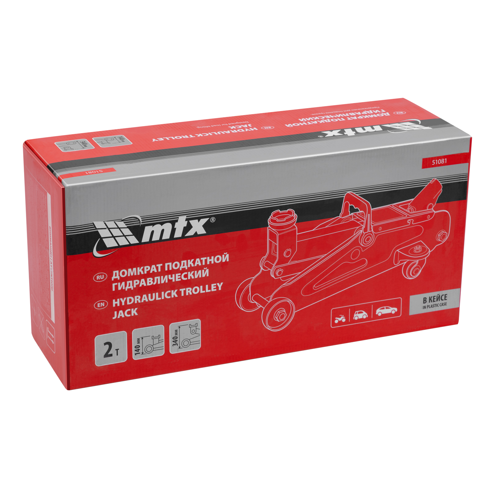 Гидравлический подкатной домкрат MTX 51081 с высотой подъема 140 мм, подхвата — 340 мм, поставляющийся в кейсе, — механизм, способный поднимать груз массой до 2 т. Высота подхвата 140 мм позволяет использовать его для автомашин со стандартным клиренсом. Домкрат предназначен для полупрофессионального использования, будет полезен как в автомастерской, так и в частном гараже.