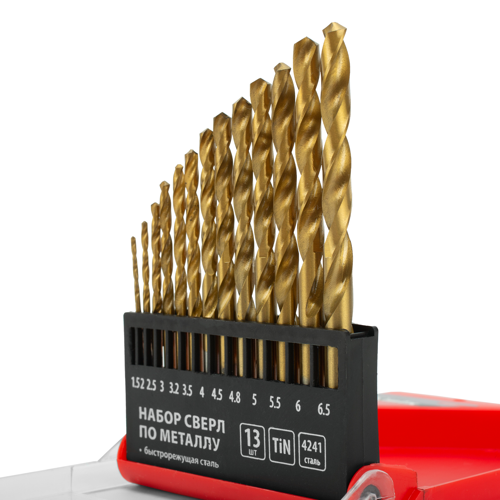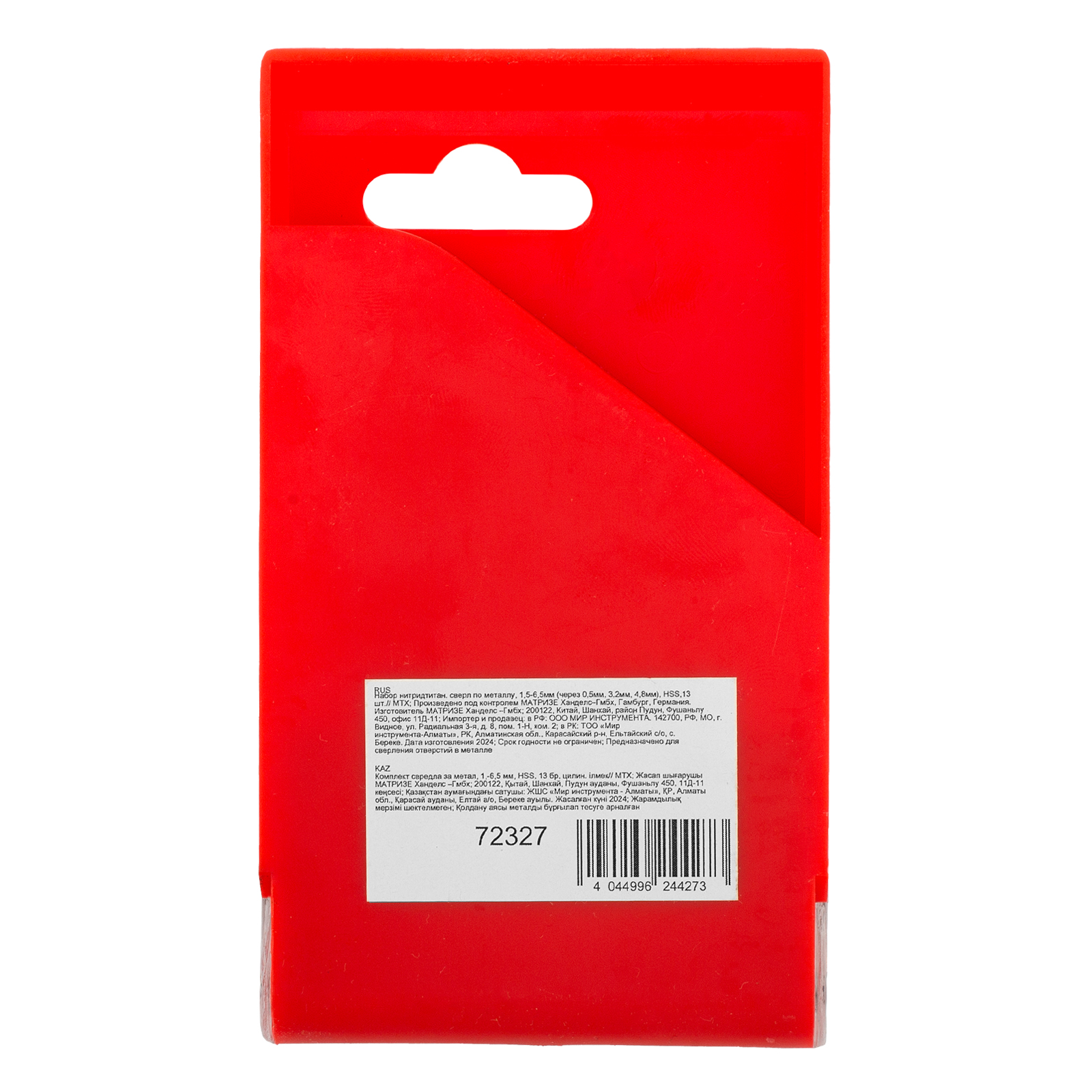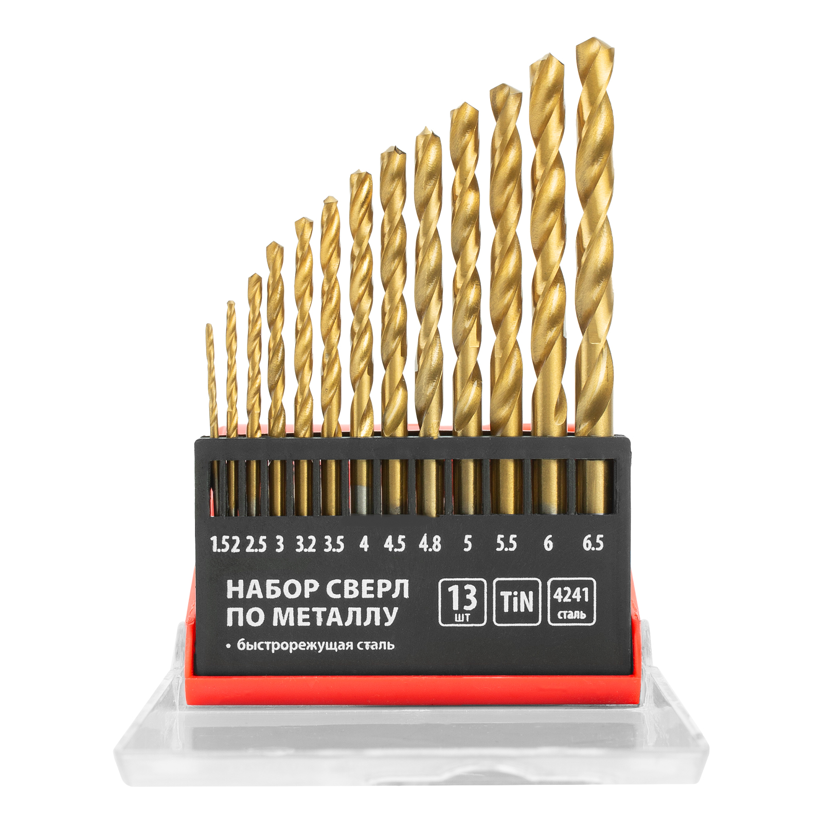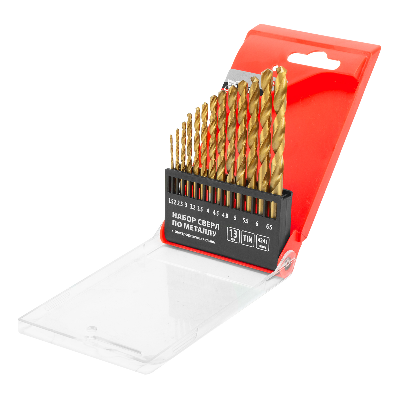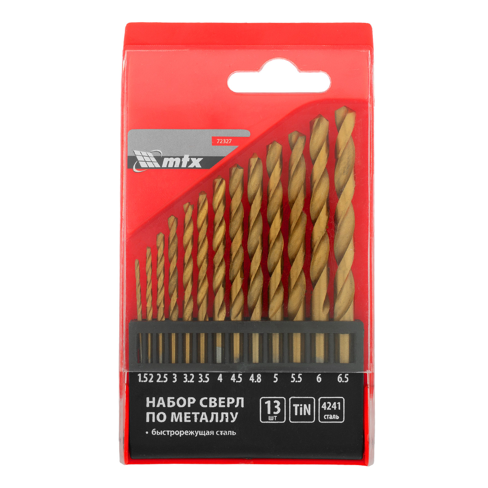 Набор нитридтитан. сверл по металлу, 1,5-6,5мм (через 0,5мм, 3,2мм, 4,8мм), НSS, 13 шт. MTX